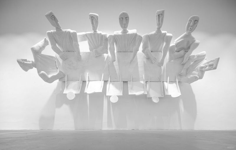 Павел Койчев, любител на „тези благородни животни“ – магаретата, се вдъхновява от книгата на Валери Стефанов „Четирите магарета“ и от четирите различни интерпретации за библейското магаре. Така той създава колекцията си от четири скулптори на магарета, изработени от четири различни материала – метал, гипс, конци, пръчки. Инсталирани на четири различни локации. Едната от които вече ви е позната добре…ако сте студент на НБУ, разбира се! А абстрактната фигура „яхнала“ металното магаре е авторска интерпретация за Създателя.