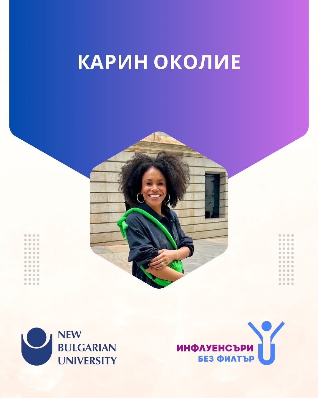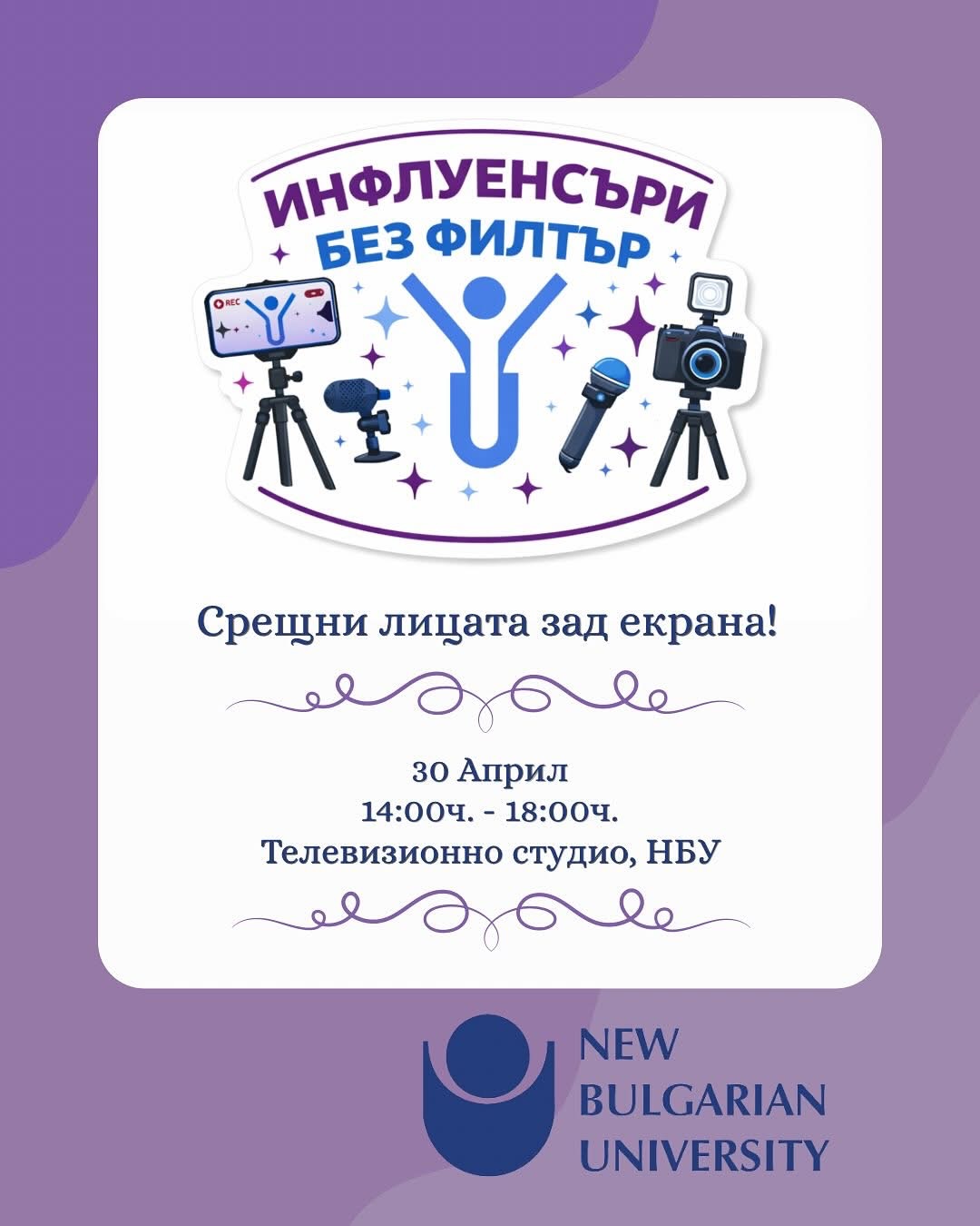 Имат ли инфлуенсърите тайни? Какво се крие зад тяхната разпознаваемост? Какви са техните „tips & tricks“ за изграждане на публичен образ в социалните мрежи? На всички тези въпроси ще бъде намерен отговор на 30 април от 14:00 ч. в РТЦ на Нов български университет, където ще се проведе събитието „Инфлуенсъри без филтър“. Предстои среща с личности, превърнали идеите си в реалност и изградили стойностно присъствие и успешна кариера в дигиталния свят. Събитието има ясна мисия: да покаже, че успехът не идва „изведнъж“, а е процес, изпълнен с постоянство, грешки, смелост, работа и упоритост. Сред инфлуенсърите, които ще разкажат своите нефилтрирани истории, са успешни млади хора, завършили или обучаващи се в НБУ. В радио-телевизионния център своя път към постиженията и разпознаваемостта ще споделят:
