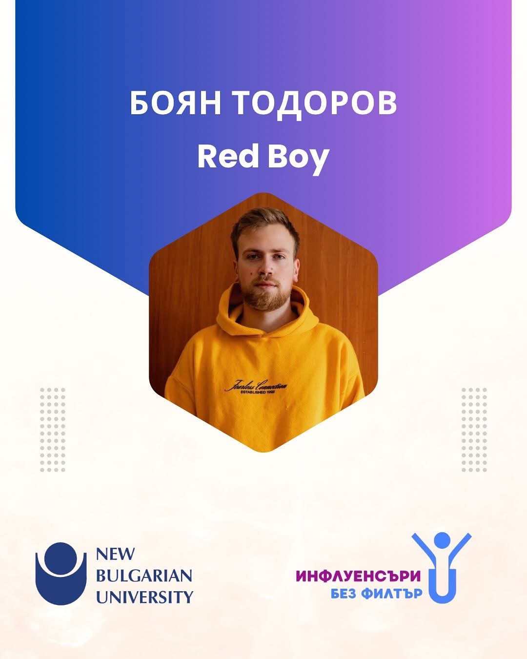 Боян Тодоров (Red Boy) – създател на позитивно и хумористично съдържание, който комбинира забавление, социални експерименти и артистичност.