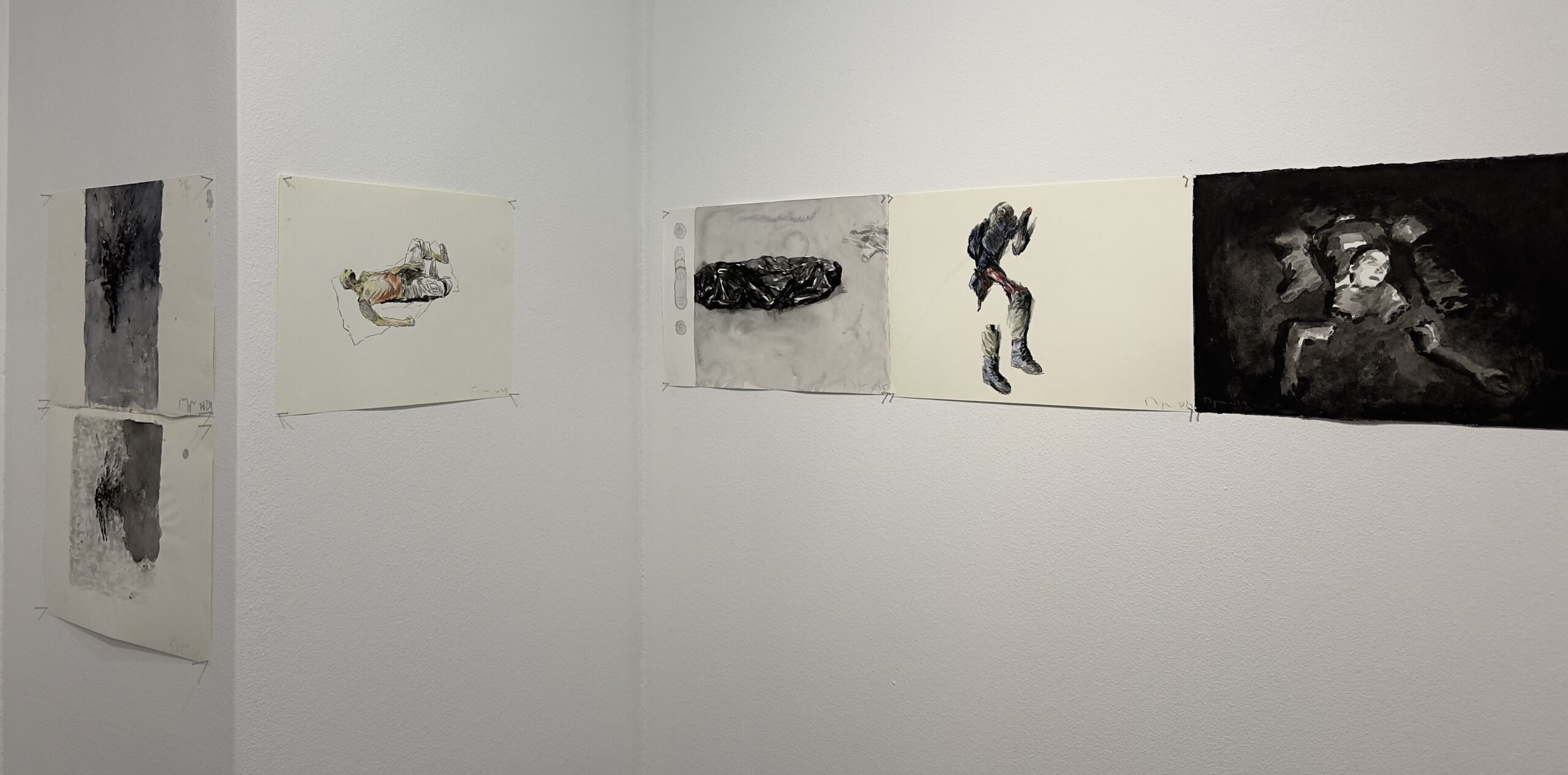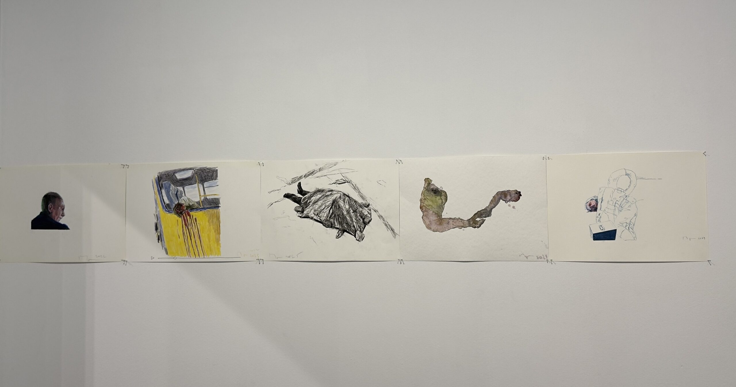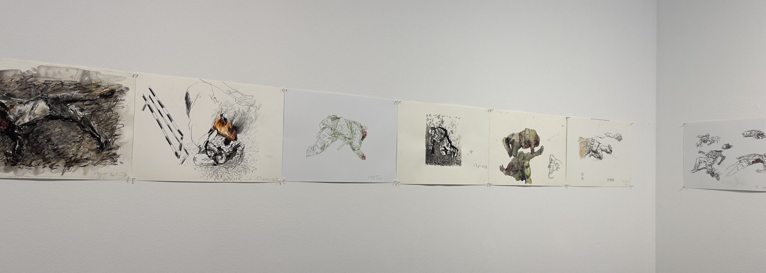 „След като го нарисувах, имах чувство, че съм го изтрил от съзнанието си.“ Това признание поставя под въпрос самата функция на изкуството. Дали рисуването е акт на съпричастност или акт на изтласкване? Терапия или бягство? Централният цикъл в изложбата „Тела във война“, възниква именно в тази амбивалентност. Рисунките са бързи и реактивни, лишени от търсена естетика. Те представляват опит да се овладее потокът от изображения, които медиите непрекъснато произвеждат.