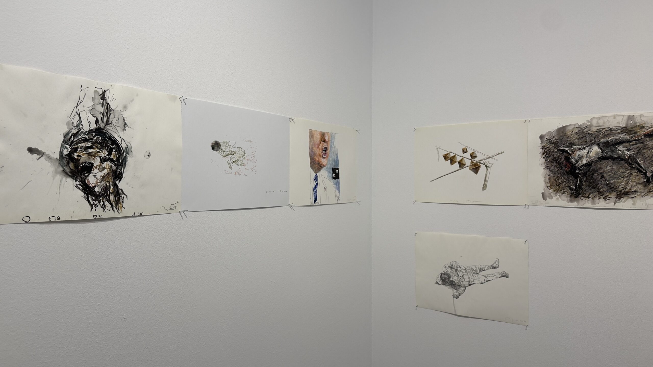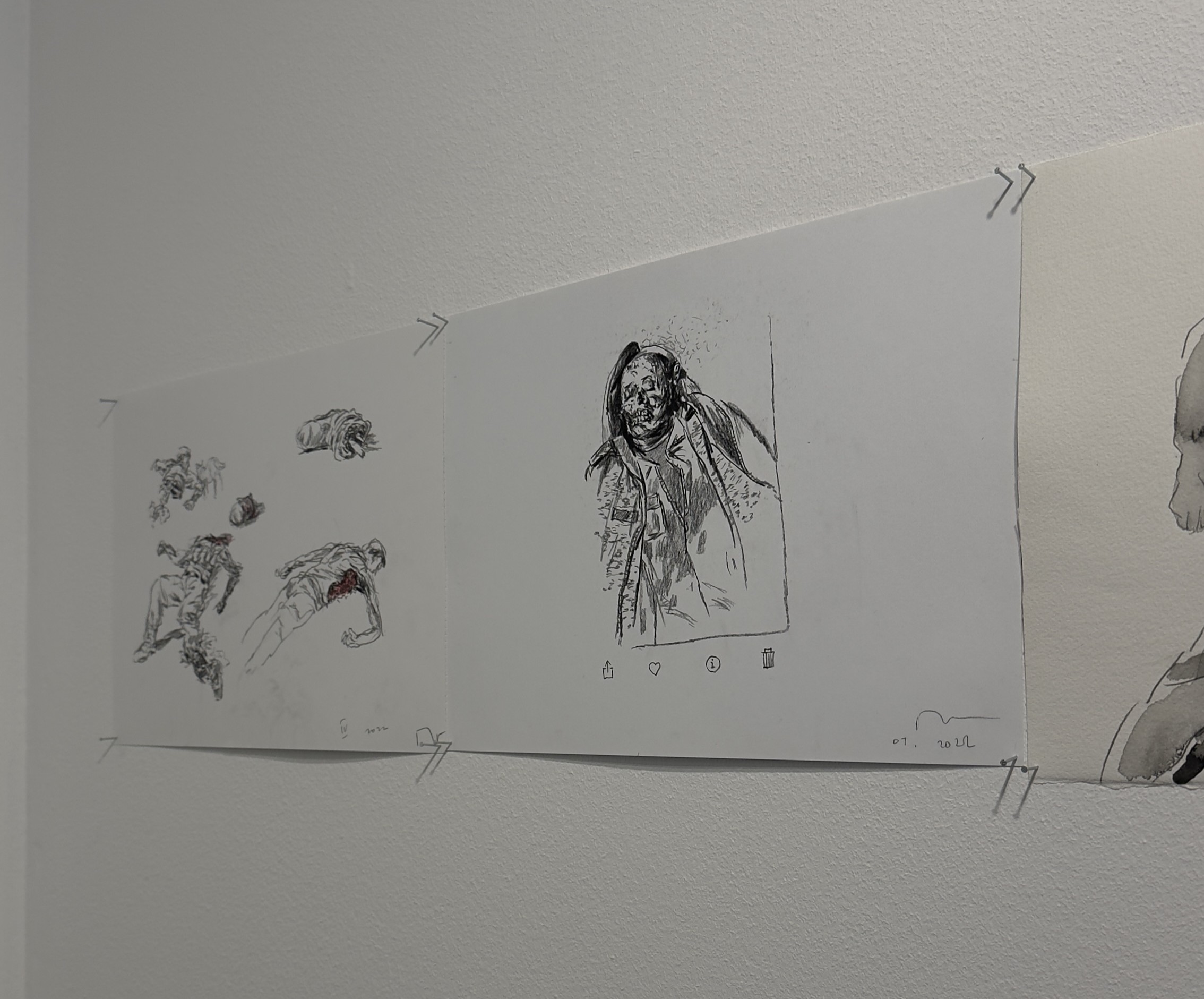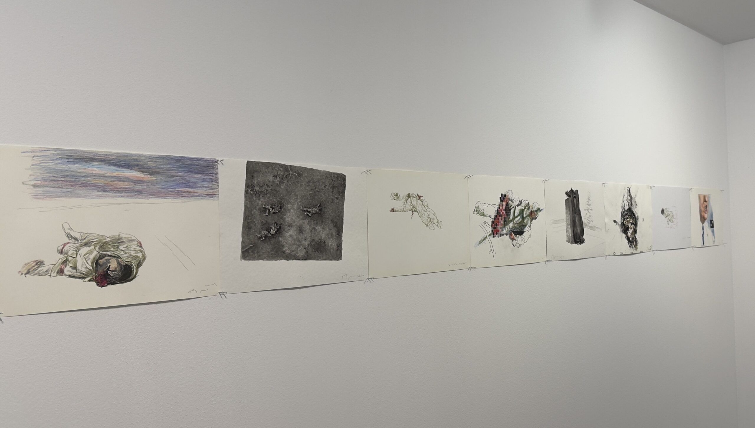 „След като го нарисувах, имах чувство, че съм го изтрил от съзнанието си.“ Това признание поставя под въпрос самата функция на изкуството. Дали рисуването е акт на съпричастност или акт на изтласкване? Терапия или бягство? Централният цикъл в изложбата „Тела във война“, възниква именно в тази амбивалентност. Рисунките са бързи и реактивни, лишени от търсена естетика. Те представляват опит да се овладее потокът от изображения, които медиите непрекъснато произвеждат.