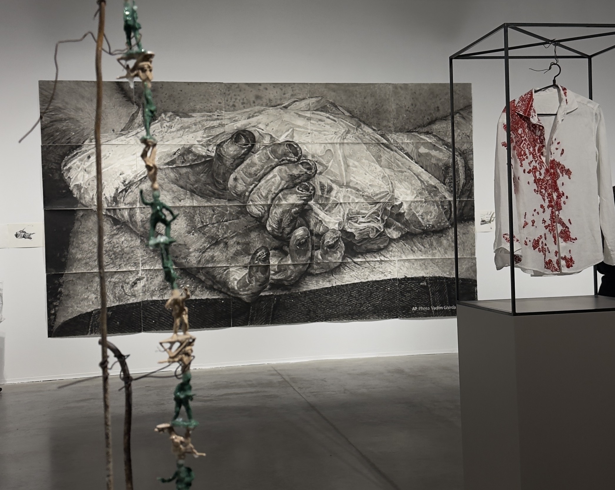 Изложбата функционира чрез отказ от стилова хомогенност. Художникът съзнателно използва различни техники и материали, за да избегне „рамката“. Това се вижда ясно в работи като „Болка за обличане“, където ленена риза с бродерия е поставена в тежка метална конструкция. Проектът започва от фотография на ранен цивилен гражданин, но се развива чрез реалното участие на украински жени, включени в процеса на изработка. Тук изкуството напуска сферата на представянето и навлиза в сферата на съпреживяването.